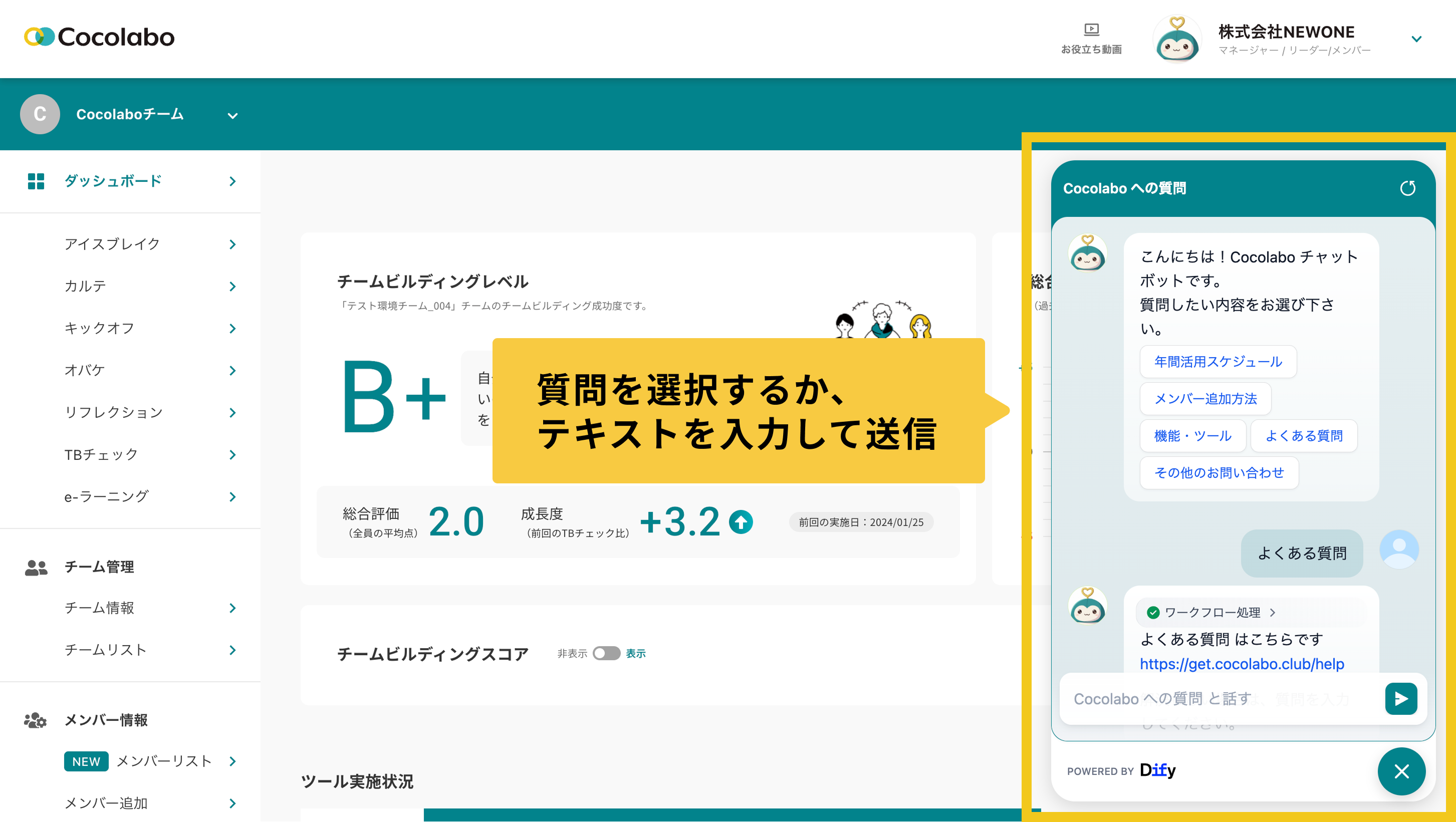 今回のアップデートで公開した「Cocolaboチャットボット」では、Cocolaboのメンバー追加方法や各ツールの使用方法・手順、使用方法に関してよくあるご質問などを、気軽に質問できるようになりました。