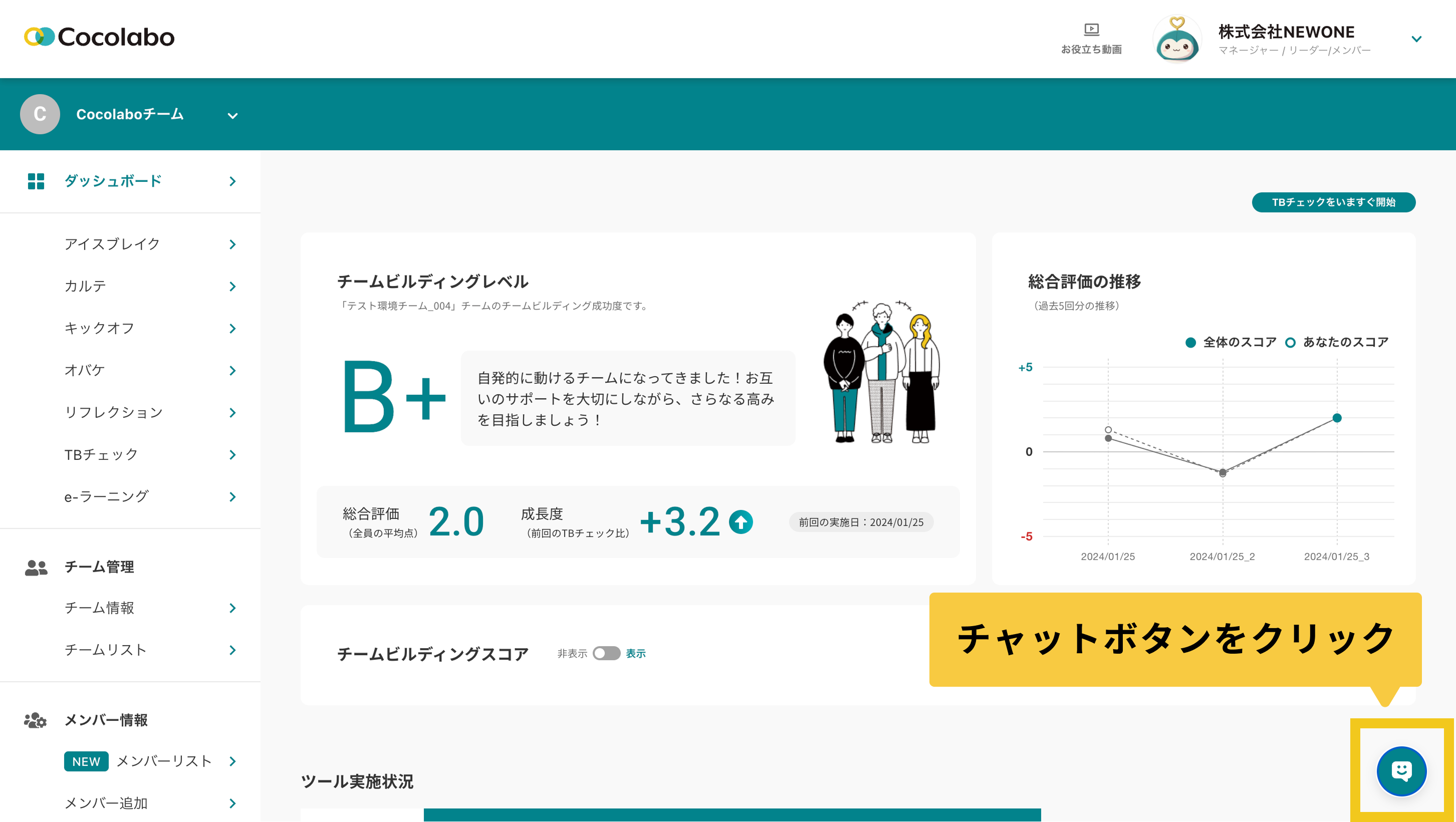 - Cocolaboダッシュボードへログイン後、画面右下の「チャットボタン」をクリック(タップ)してください。