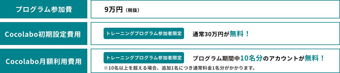 初期費用(通常30万円/税別)と、プログラム期間内のメンバー10名分のアカウントを無料でご利用いただくことができます。