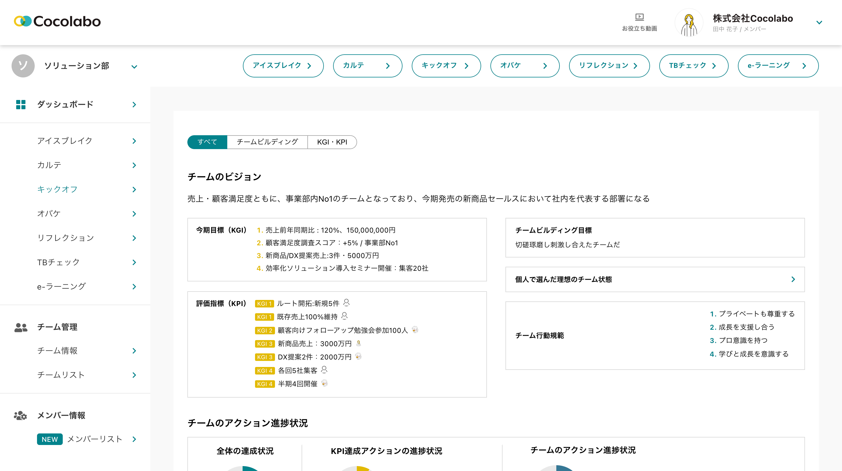 今回のアップデートでは、「キックオフ」のツールにおいて、チームのビジョンや業務目標(KGI・KPI)、アクションを登録できる機能が追加されました。