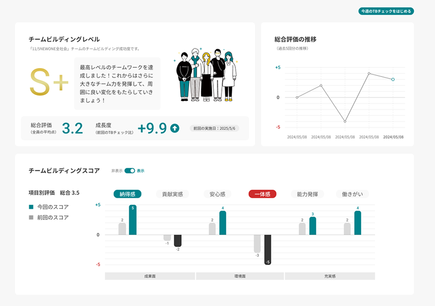 - チームビルディングレベル: チームの状態を総合的に評価したもので、S+からD-までの15段階でレベル表示されます。これにより、チームが現在どの段階にあるのかを一目で把握でき、総合スコアと成長度も確認できるため、成長の度合いを実感できます。